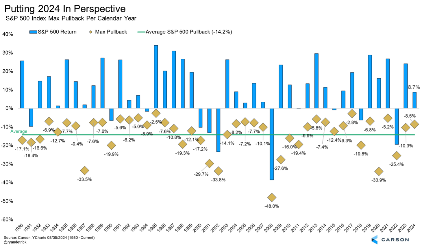Since 1980, the average year sees a peak-to-trough move of 14.1% and gain of 10.3% for the year. As of Monday, the S&P 500 had pulled back 8.5% from the mid-July peak and was still up a solid 8.7% for the year. Sure it is a far cry from the nearly 19% gain in mid-July, but where we are now isn’t all that bad, or all that different from a typical year.