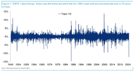 In response, the Japanese stock market had it’s worst two-day return ever, including falling 12.4% Monday, the second worst single day ever (only 1987 was worse).
