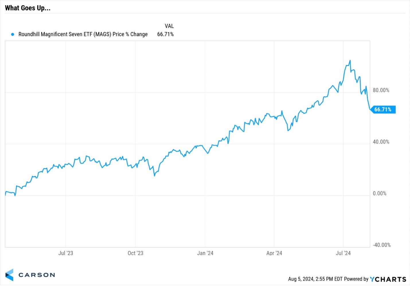 How overextended were these areas of the market? Well, there’s an ETF that is based on the Magnificent Seven stocks (think the biggest technology-oriented companies in the world) and that ETF had more than doubled since last spring. This group was ripe for a violent move. Still, don’t forget that the Mag 7 delivered nearly 30% earnings growth this most recent earnings season. These companies have been strong earnings engines — the market just got carried away by its enthusiasm.