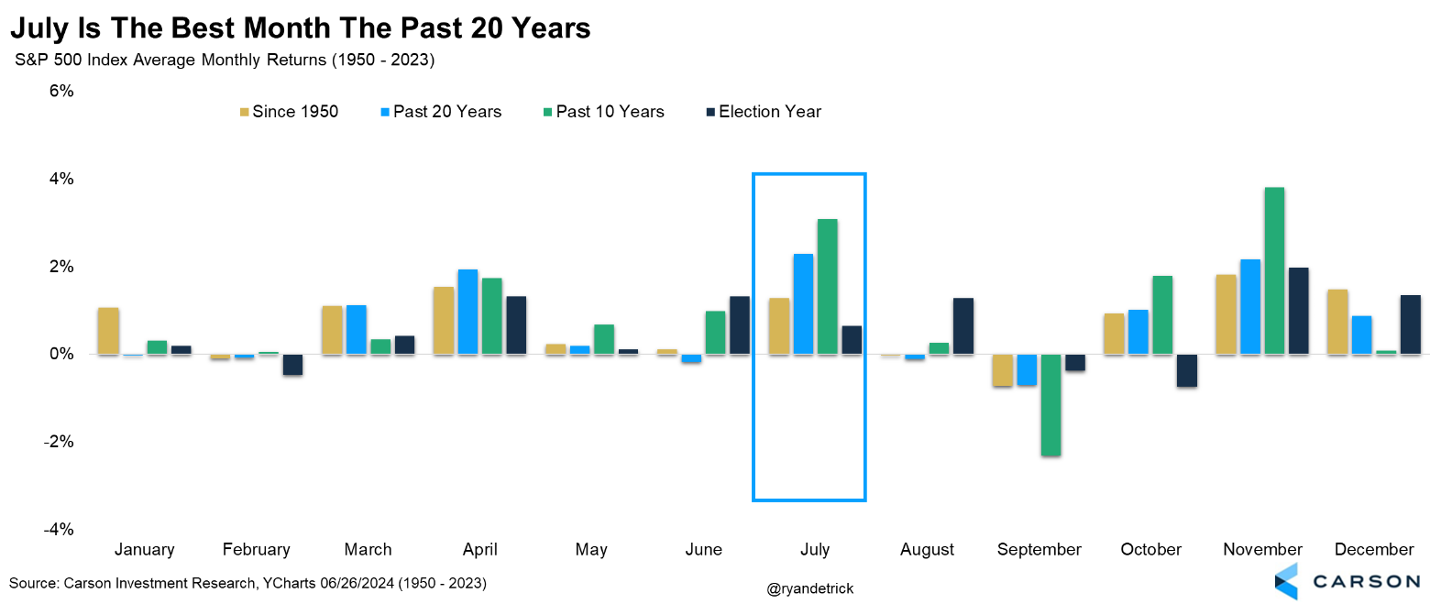 - July has been the best month of the year over the last 20 years and second best over the last 10.
