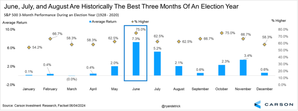 As we’ve mentioned many times lately, summer rallies in election years are quite common. In fact, the S&P 500 has gained more than 7% on average in an election year in June, July, and August. For those thinking this summer rally is running on fumes, we’d argue there still could be some left in the tank.
