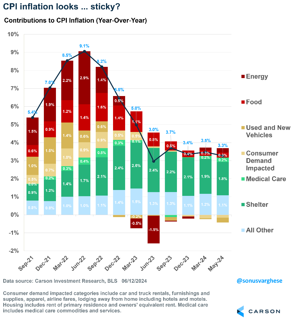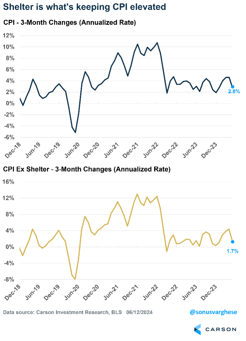 The Consumer Price Index (CPI) report was a welcome “surprise” after a string of uncomfortably hot inflation reports. Headline inflation was flat in May, while core inflation (stripping out volatile energy and food components) rose 0.16%, which corresponds to an annualized pace of exactly 2%, all softer than what forecasters were expecting. At the same time, headline CPI is now up 3.3% since last year, and it looks like we’ve made no progress on inflation since last fall. But a closer look at the data below tells you that shelter (in dark green) continues to keep official inflation data elevated.