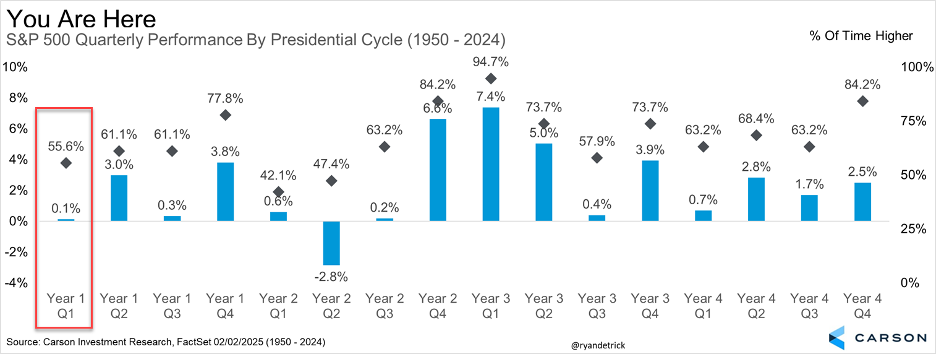 Here’s a nice chart that shows the first quarter of a post-election year is the second weakest quarter out of the entire four-year Presidential cycle. In other words, after back-to-back 20% gains the past two years, maybe a well-deserved break to kick off 2025 is perfectly normal.