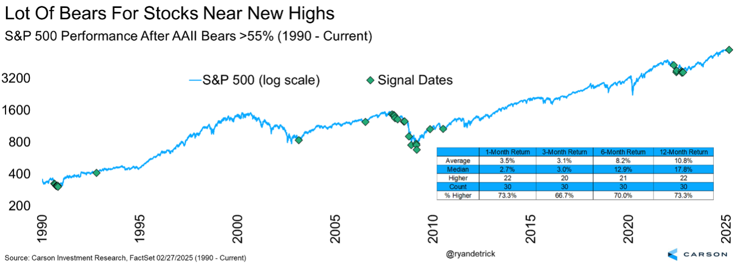 The American Association of Individual Investors (AAII) Sentiment Survey showed more than 60% bears for only the seventh time in history (going back to when the poll started in 1987). Here’s the catch. Those other times we saw fear similar to this were times like the recession and near bear market of 1990, October 2008 and March 2009 during the Great Financial Crisis, and the end of the bear market in 2022. In other words, stocks were down substantially before fear truly spiked, making what we are seeing now truly rare and uncharacteristic.
