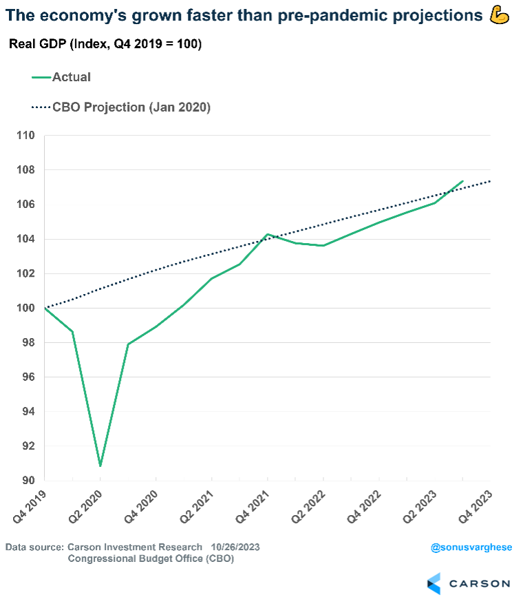 Consider this: Real GDP growth has grown faster than what the Congressional Budget Office projected just before the pandemic in January 2020. It also projected the unemployment rate in 2023 would be 4.4%. It’s 3.8% now.