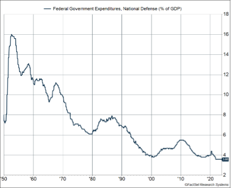Defense spending rose at an annualized pace of 8% in the third quarter, the fastest pace since the fourth quarter of 2020. Defense spending is currently just 3.6% of GDP, which is close to an all-time low. It’s likely this moves higher going forward.