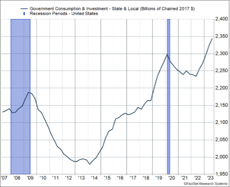 State and local government spending makes up 11% of the economy, which is significant. Governments cut back significantly between 2020 and 2022, in preparation for a storm. But they’re starting to ramp up spending and investment, and this is likely to continue over the next few quarters. Sales taxes and property taxes should remain strong if spending is resilient, which is likely if the economy avoids a recession as we expect, and a housing market crash is averted, which is also likely given demand dynamics. This runs in sharp contrast to the global financial crisis, after which states struggled and cut back on spending for several years.