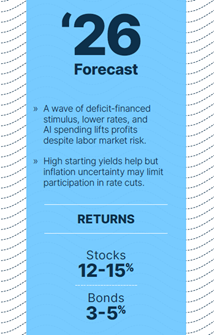As we look ahead to 2026, we just don’t see the forces in play that typically lead to a recession. To the contrary, we see the economy likely riding a wave of lower interest rates, strong fiscal stimulus, and continued investment in AI infrastructure. Those forces inform our base case forecast of a 12% to 15% total return for the S&P 500 in 2026 and a 3% to 5% return for the Bloomberg US Aggregate Bond Index.