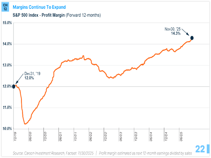 S&P 500 earnings are expected to grow by approximately 14% in 2026, a number we think is quite attainable. This isn’t just hype: Profit margins are expanding and hitting cycle highs as well. When companies are making more money per dollar of sales, that is a tailwind that’s hard to bet against.