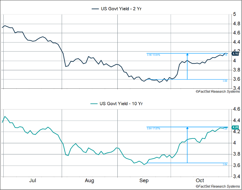 All this to say, it wouldn’t be surprising to see GDP growth revert to the 2-2.5% range (or even lower) in Q4 2024 and Q1 2025. This is not to say we’ll be in a recession – far from it – but it seems like investors are wildly optimistic. More than the equity market, we’ve seen this in the bond market. Since the Federal Reserve’s (Fed) meeting on September 18, the 2-year US Treasury yield has risen 0.56%-points to 4.16% and 10-year US Treasury yield has risen 0.64%-points to 4.28% (driving mortgage rates higher). This is counterintuitive, since the Fed went big with a 0.50%-point cut at their September meeting and projected more cuts into 2024 and 2025. However, to a first approximation, yields are essentially expected Fed policy rates in the future. If economic growth is expected to be strong, there’s presumably less reason for the Fed to cut rates by a lot.