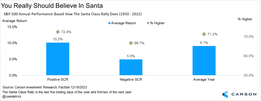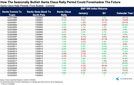 - The “Santa Claus Rally” calendar effect started on Friday, Dec. 22, and runs through Jan. 3, capturing a strong period for stocks as well as a potential harbinger for things to come.