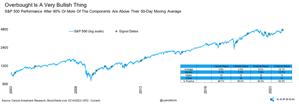 During the week of Dec. 11, more than 90% of stocks in the S&P 500 rose above their 50-day moving averages. This might mean we are near-term overbought, but this kind of strength is often evident at the beginning of bullish moves. Over the past 20 years, the S&P 500 has moved higher 14 out of 15 times one year after such strong participation and has risen 16.1% on average. This is yet another clue stocks could be in a for a strong year in 2024.