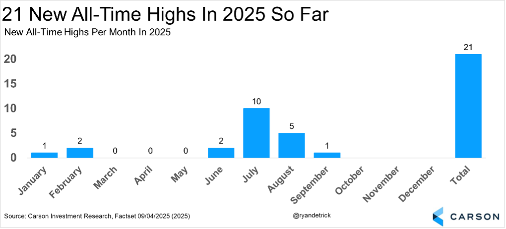 This brings us to six of the first nine months of 2025 registering a new all-time high. Although we do have near-term potential worries over the coming weeks (as we have discussed the past several weeks), the reality is any weakness should be fairly contained and may provide a buying opportunity.