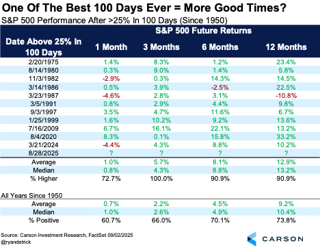 The S&P 500 was up more than 28% the 100 trading days after the April 8 lows, which was one of the best 100-day rallies ever. As we noted many times back in the midst of the worst of the tariff-related meltdown, it is perfectly normal for the worst 100 days to take place right next to the best 100 days. Thankfully history played out once again and those that sold because of the volatility and scary headlines missed a golden opportunity.