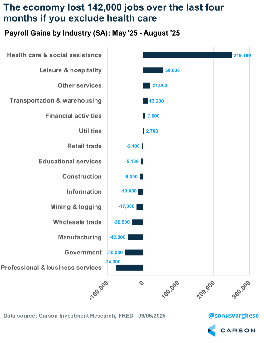 From May through August (the post-Liberation Day phase), the economy created 107,000 jobs. But get this: the health care sector created 249,000 jobs. Without that, the economy would have lost 142,000 jobs over the last four months. The weakness is across the board in cyclical areas: