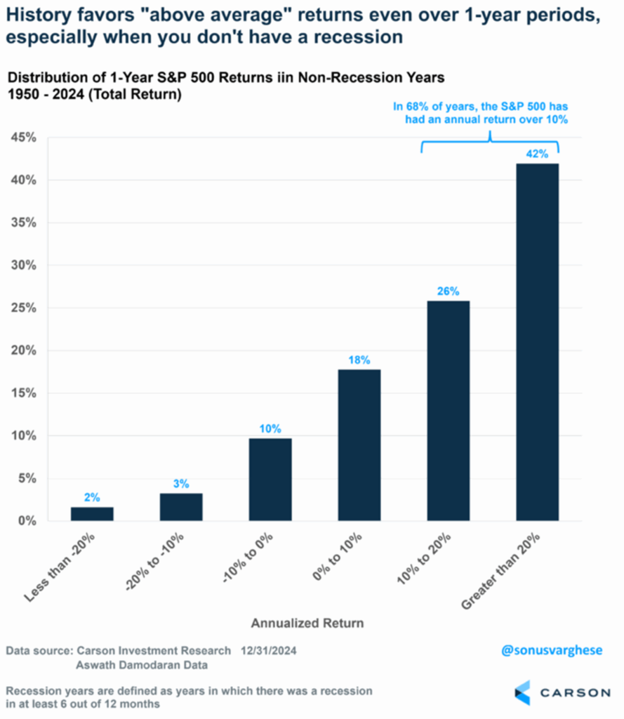The big takeaway to me is that more than 60% of the time, stocks are up double digits — not bad, not bad. Now, what about if you avoid a recession during the year? Remember, this is still our base case for 2026.