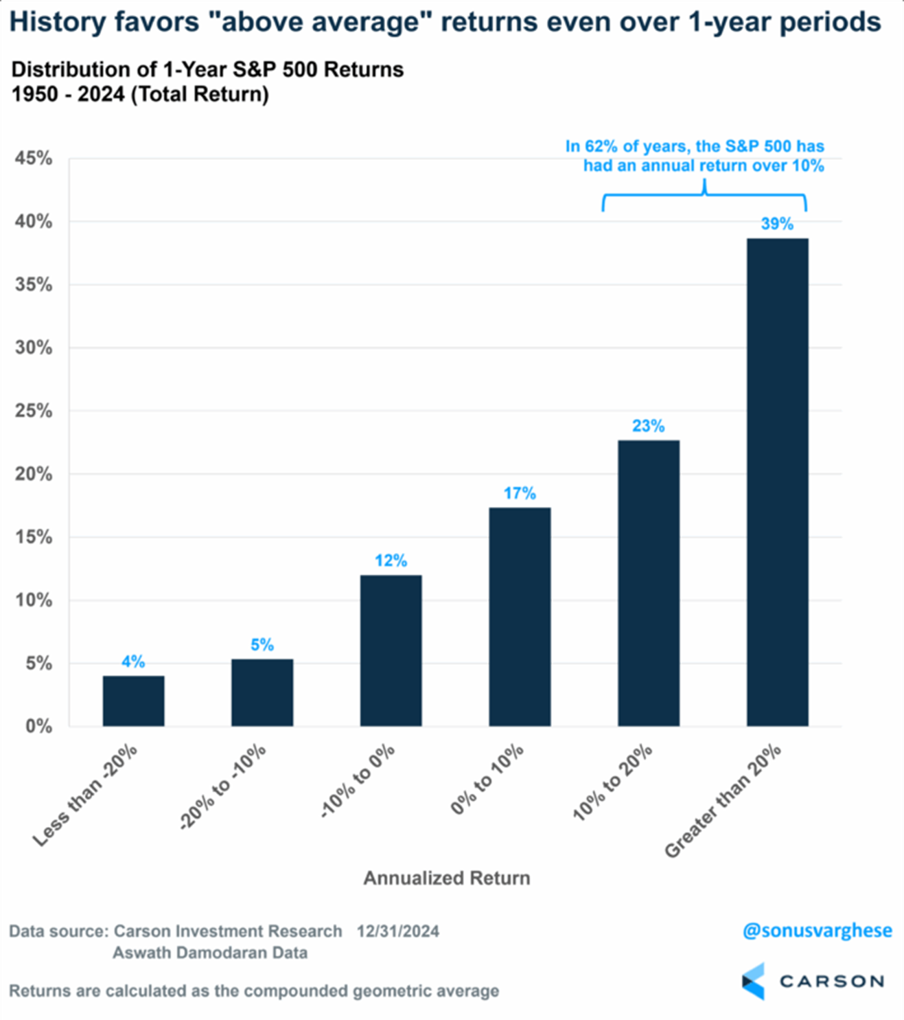 Image Depicting Distribution of 1-yesr S&P 500 Returns 1950-2024 (Total Return)