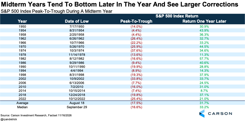 Here’s each midterm year broken down. What stands out is that they don’t tend to bottom until later in the year (August 18 on average, or a median of September 29). Still, look at those returns a year later. Should we see some typical midyear volatility, it could be very important to stay the course and not panic.