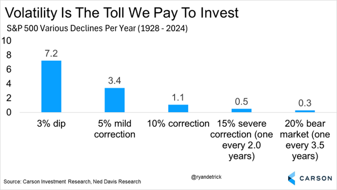 We’ve shared the chart below many times, but when times get scary and aggravating, it’s worth sharing again. The average year for the S&P 500 sees more than three different 5% mild corrections a year, which puts the two we’ve seen this year in perspective.